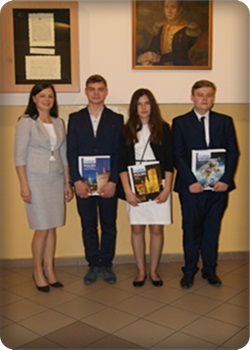 Karol Katra, Jakub Fit, Miłosz Wójcik - finaliści IV Świętokrzyskiego Turnieju Innowacji i Kreatywności -opiekun mgr Danuta Stanek