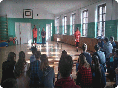 W piątek 04. 11.2016 r. w piotrkowickich oddziałach gimnazjum zostały przeprowadzone warsztaty pod hasłem: „ Pomagamy i uczymy pomagać. Co robić w nagłych wypadkach?” Ratownicy z Grupy Ratownictwa PCK z Kielc przeprowadzili bardzo ciekawe zajęcia z udzielania pierwszej pomocy. Gimnazjaliści mogli obejrzeć profesjonalny pokaz resuscytacji krążeniowo – oddechowej oraz byli bezpośrednio zaangażowani przez ratowników w ćwiczenia przywracające przytomność poszkodowanym czy drożność dróg oddechowych. Uczniowie zostali poinstruowani, jak tamować krwotoki, opatrywać rany i urazy, zachować się w przypadku omdleń, czy przywrócić oddech osobom nieprzytomnym.