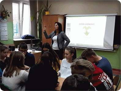 W związku z obchodzonym w październiku ŚWIATOWYM DNIEM GODNOŚCI uczniowie naszej szkoły uczestniczyli w warsztatach z psychologiem pn. „Człowiek to brzmi dumnie”. Przeprowadzone spotkanie miało na celu budowanie świadomości młodego człowieka, że każdy zasługuje na życie w poczuciu godności. Podejmując codzienne decyzje powinniśmy dbać nie tylko o swoją godność, ale także drugiego człowieka.